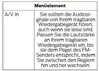 Sie können die A/V-Eingänge auch als Eingang für externe Geräte verwenden und so über die Lautsprecher Ihres Fahrzeugs Musik aus Ihrem tragbaren Musikplayer abspielen. Stecken Sie ihren RCA-Adapter (1/8 Zoll/3,5 mm) in die beiden AV-Eingangsbuchsen (rot und weiß) auf der linken Seite.