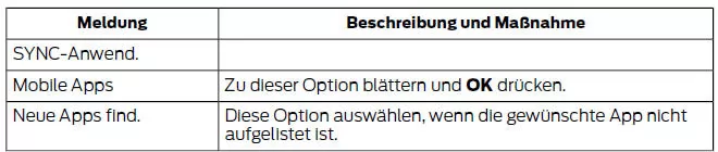 Beachte:Wenn eine SYNC AppLink-fähige App nicht gefunden werden kann, vergewissern Sie sich, dass die gewünschte App auf dem Mobilgerät ausgeführt wird.