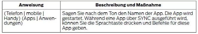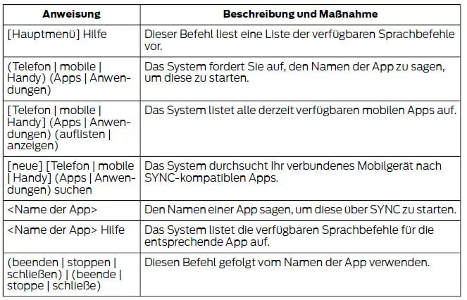 Das System ermöglicht die sprachgesteuerte und manuelle Steuerung von SYNC AppLink-fähigen Smartphone-Apps. Wenn eine App über AppLink ausgeführt wird, können die Hauptfunktionen der App über Sprachbefehle und manuelle Bedienelemente gesteuert werden.