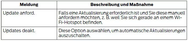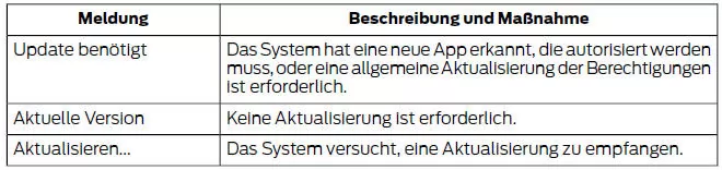 Beachte: Es fallen die regulären Datengebühren an. Ford übernimmt keinerlei Haftung für zusätzliche Gebühren, die Ihnen Ihr Dienstanbieter für das Senden um Empfangen von Fahrzeugdaten über das verbundene Gerät in Rechnung stellt. Hierzu gehören Roaming-Gebühren, die anfallen, wenn Sie außerhalb Ihres regulären Mobilfunknetzes unterwegs sind.