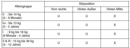 U : Geeignet für Rückhaltesysteme der Kategorie "Universal", die für die Verwendung in dieser Gruppe zugelassen sind